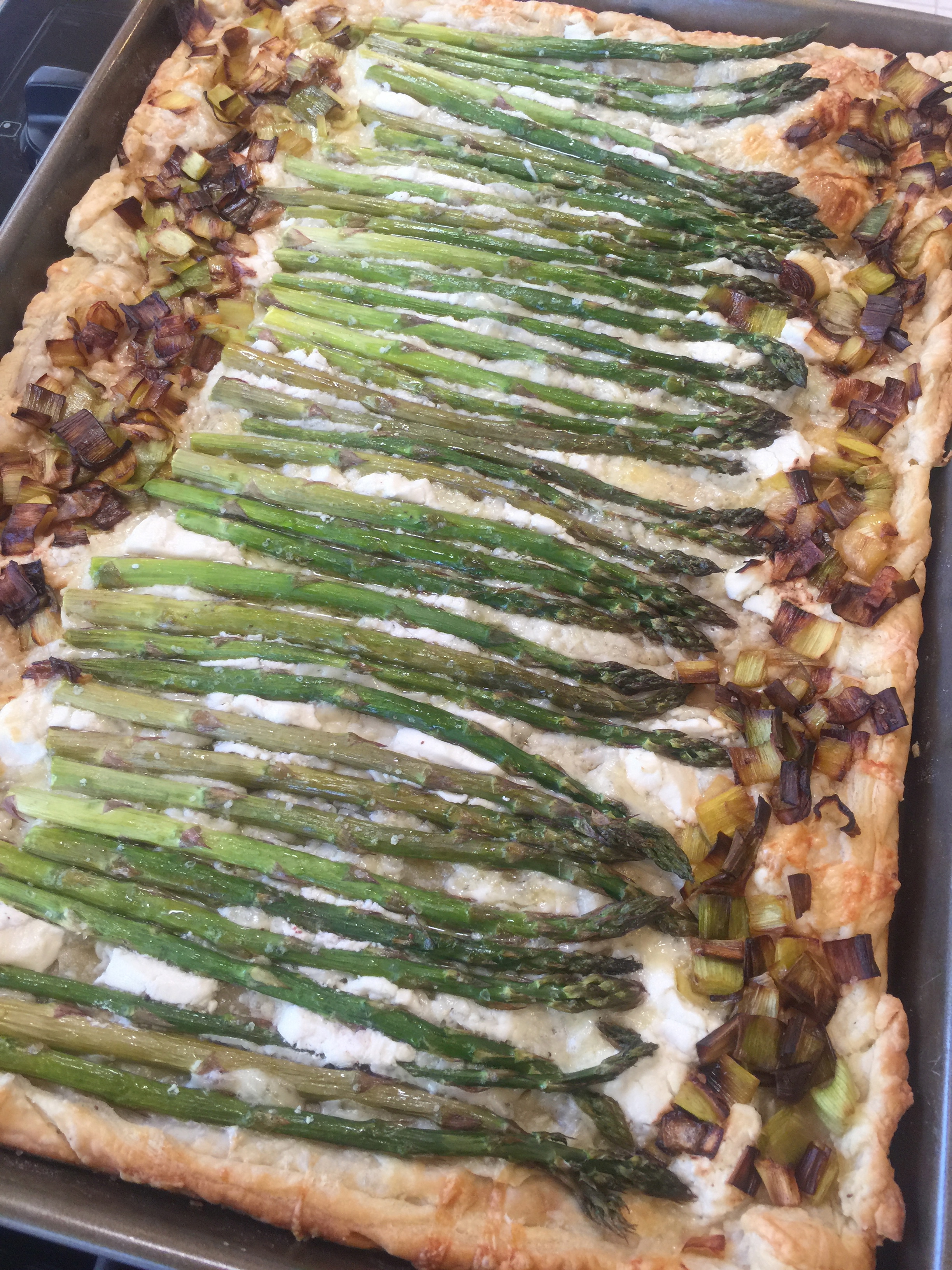 And now the technical part, I roll out 2 puff pastry sheets and fit them into a jellyroll pan. I then fold the edges and score them all around and poke the center of the pastry with a fork. After that, I lay down the cheese and then run the asparagus down the middle in a single row, line the edges with the leek, and pop it in the oven for 20-25 minutes! Honestly, it’s almost TOO easy! Oh well, so much for technical merit LOL!