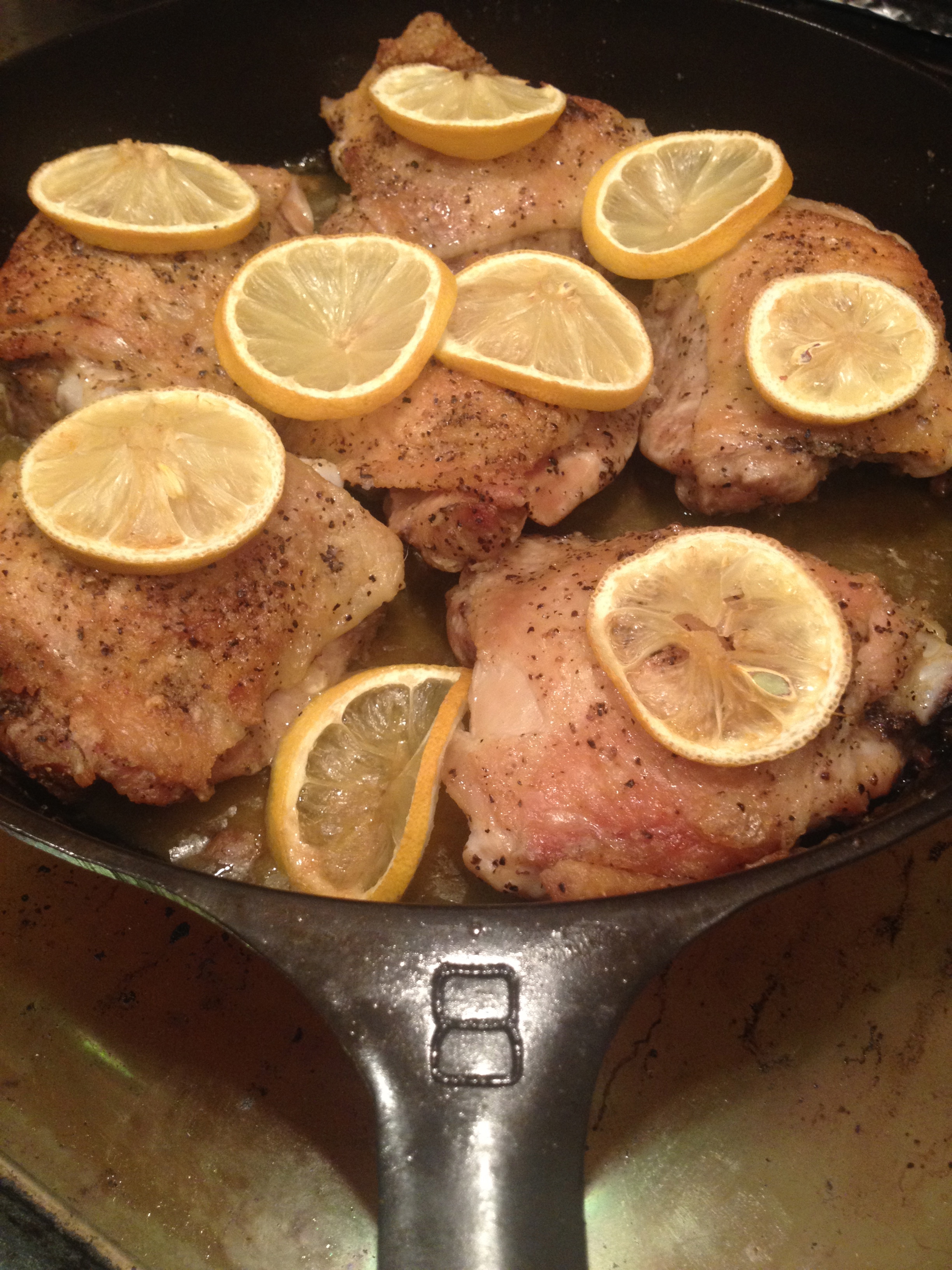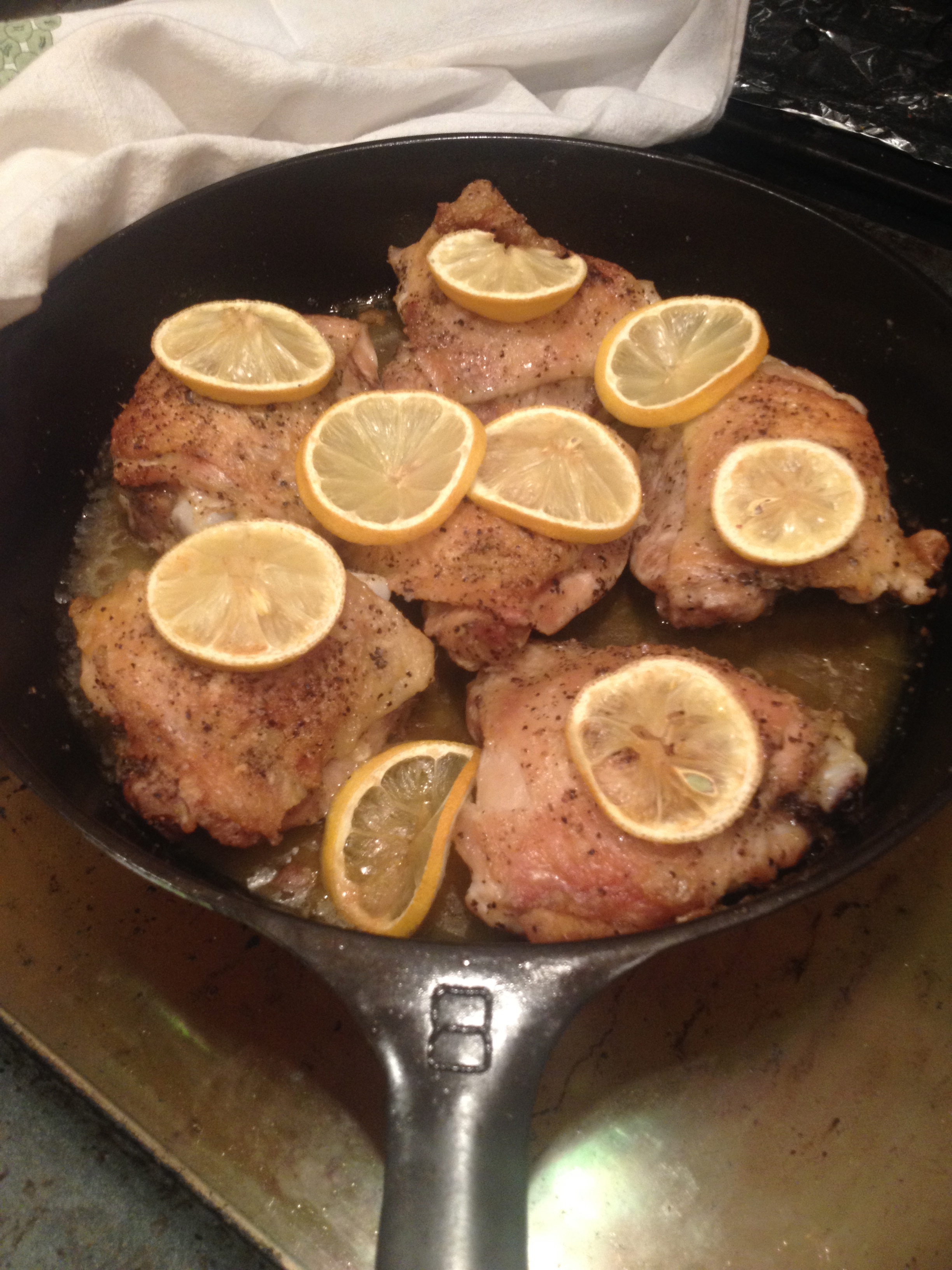 4. Pour off the excess fat from the pan. Return the chicken, skin side up, to the pan and scatter the lemon slices on top. Transfer to the oven and roast until an instant-read thermometer inserted into the thickest part of a thigh, away from the bone, registers 170°F (77°C), 25-30 minutes.