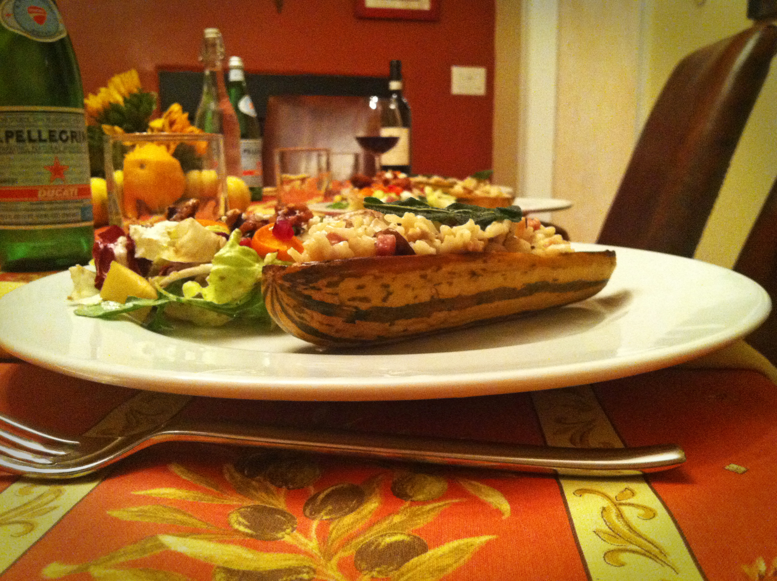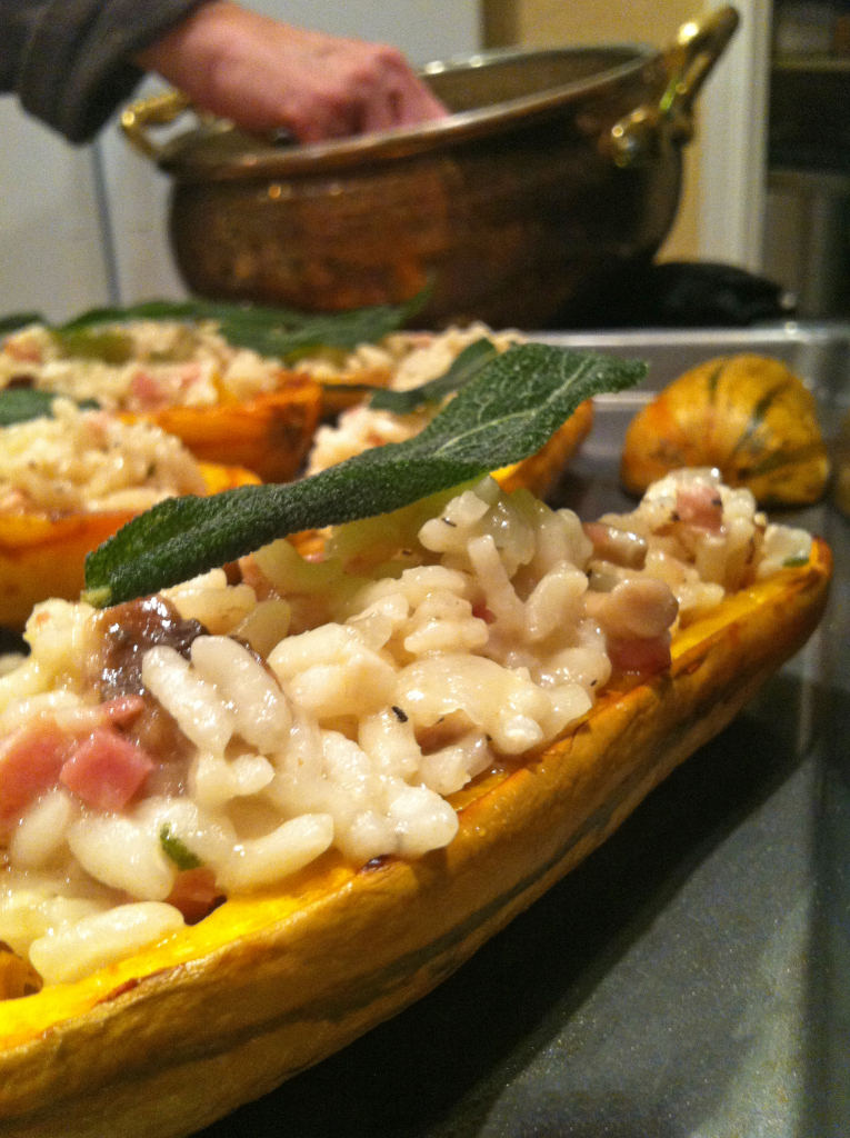I decided to add porcini mushrooms, pancetta, and fried sage to her recipe and use roasted delicata squash from our garden to serve it in. It’s a 100% edible and makes for a great presentation.