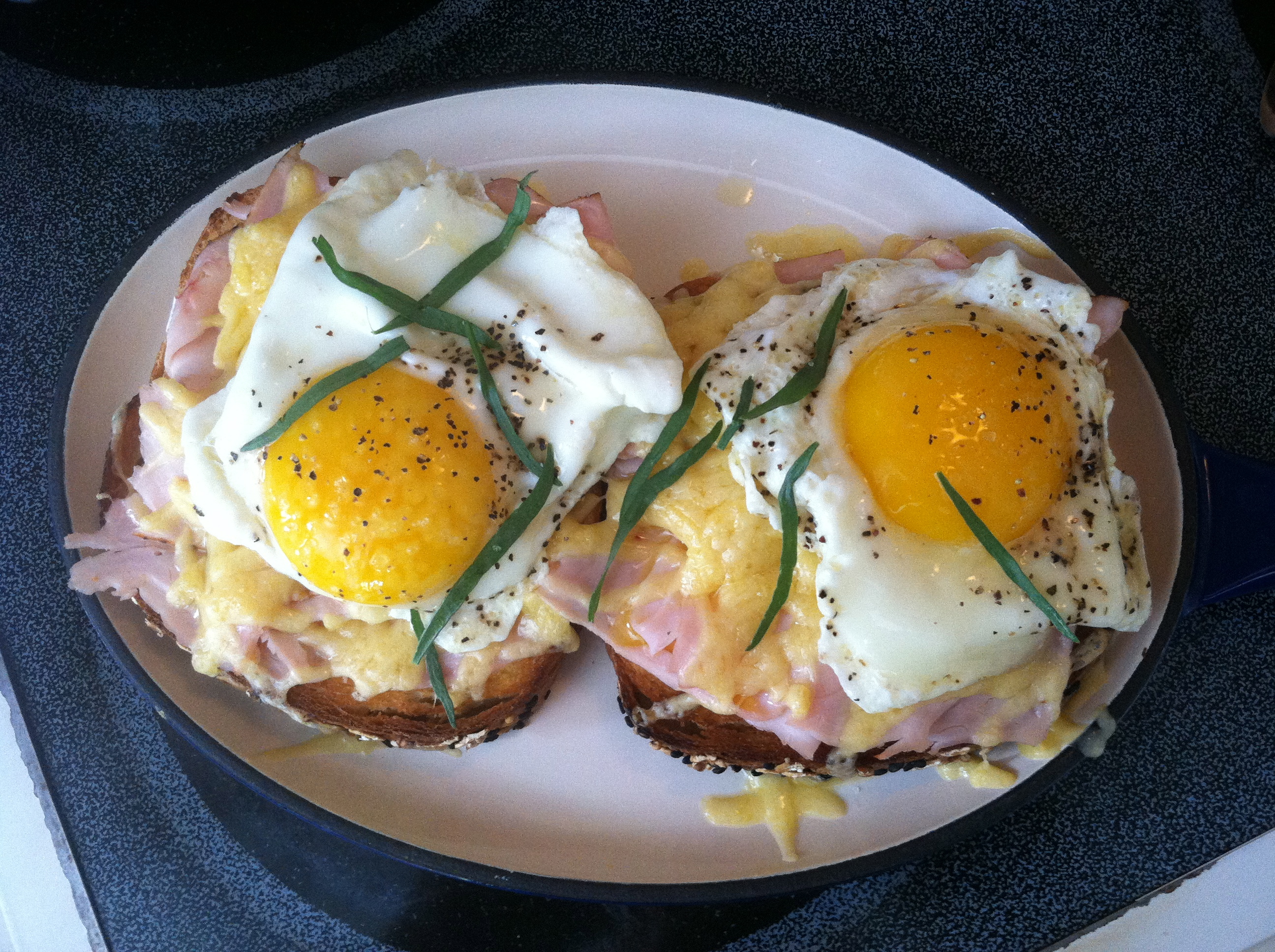 I do find the key to this is to find your favorite artisanal bread (mine is an onion loaf from a French bakery), GREAT black forest ham from a deli, and delicious gruyere cheese from a local cheese monger and then you don’t have to worry about the béchamel unless you can’t live without it. This version of eggs over black forest ham and gruyere cheese gives you an excuse to not have to add on another 20 minutes to make the sauce which leaves more time to indulge wherever you heart takes you!