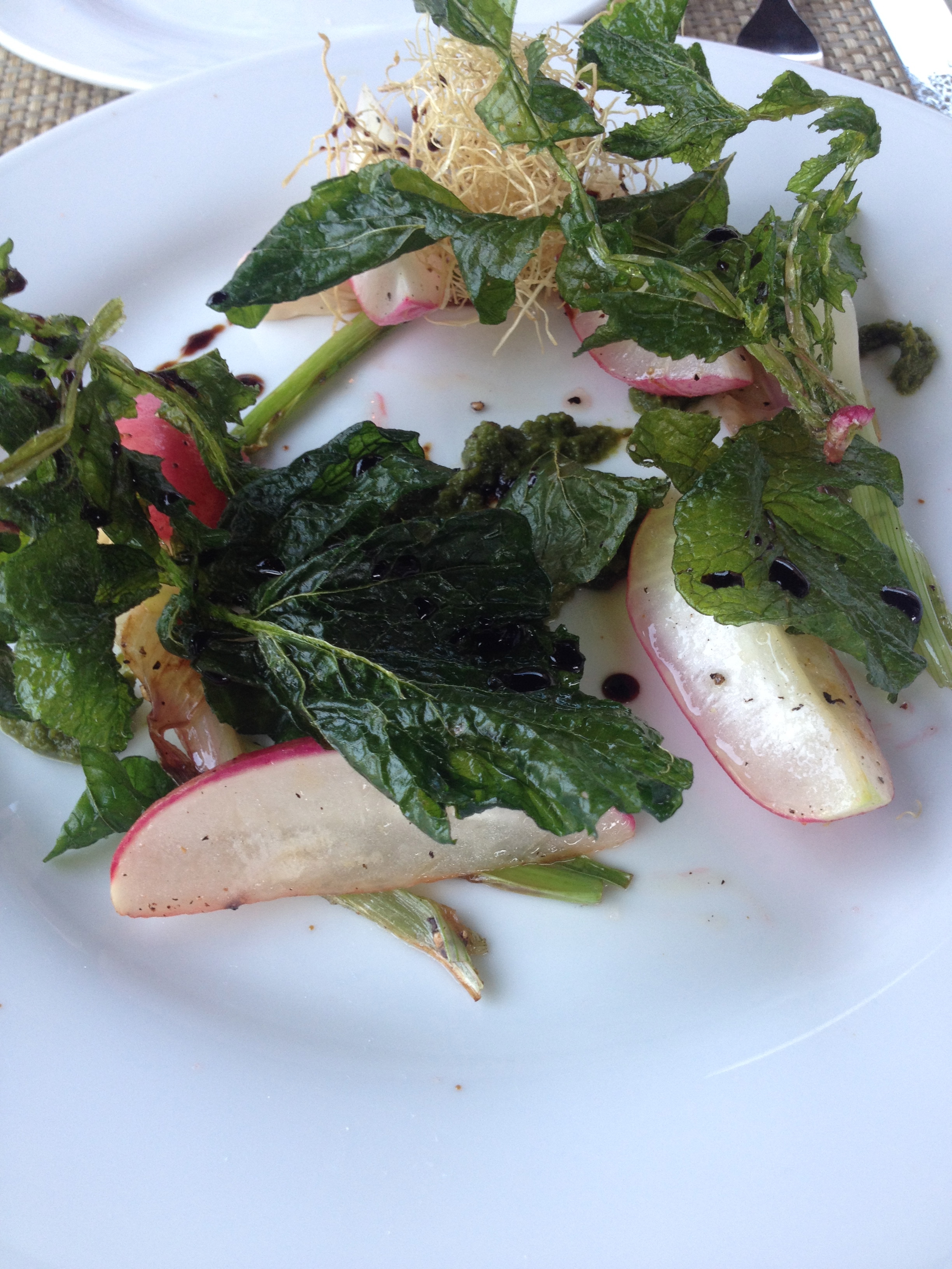 1. In a saute pan over medium heat, heat 2 T of olive oil and put in scallions and cook until browned a little on all sides, remove and keep warm. Add radishes and a little more olive oil. Cook until "blistered" and a bit soft. Remove and keep warm. Add a little sea salt to both
