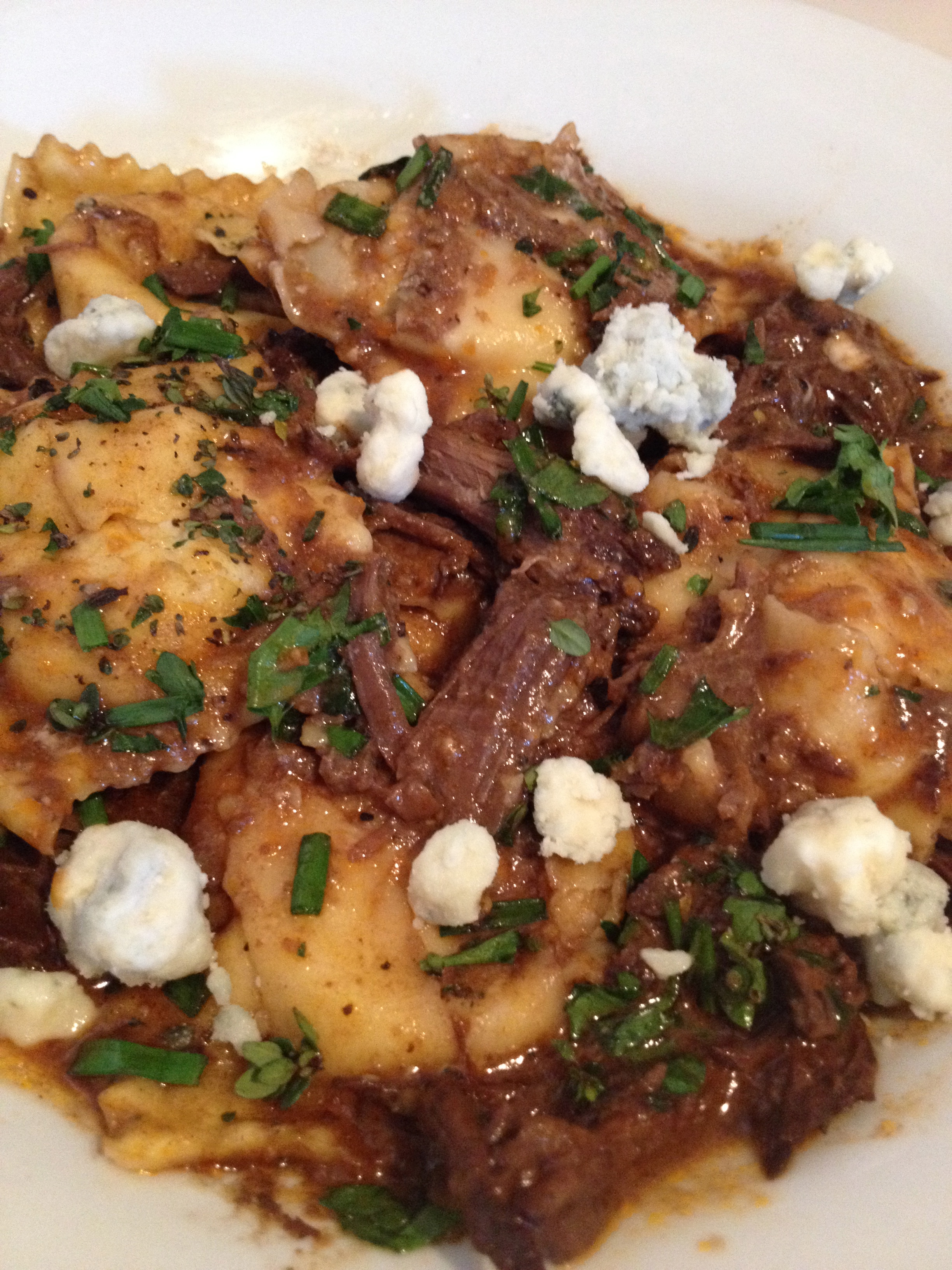 - To serve: Place t6 pieces of cooked ravioli on a plate along side some pulled meat from the short rib. Pour 3 to 4 ounces of the demi-glace over the top and garnish with the chopped herbs fine and gorgonzola crumbles.