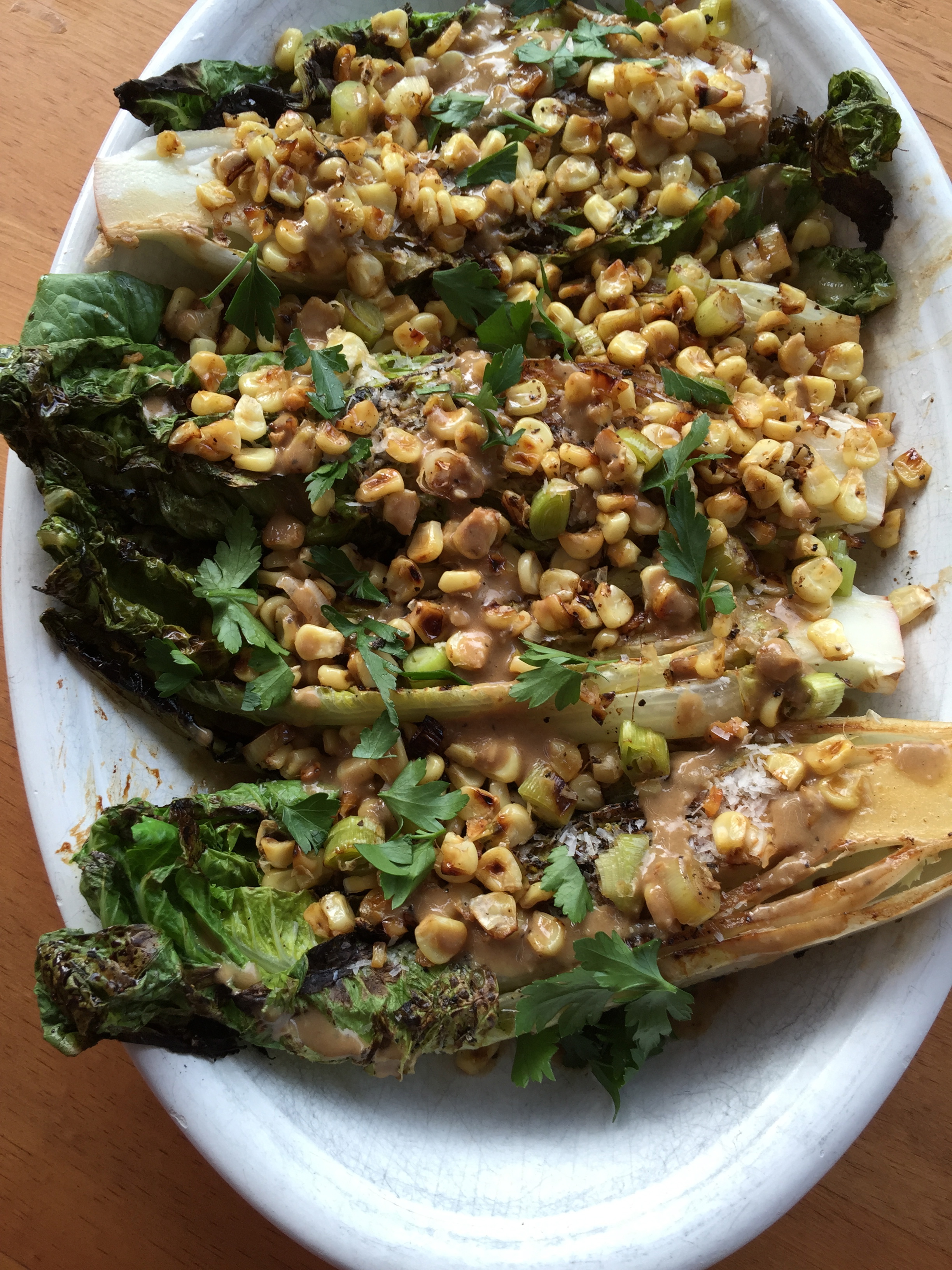 - Spoon cooked corn and leek over the grilled romaine.
