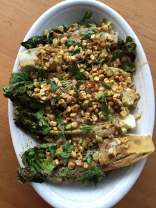One of the most forgotten flavors for me is grilled romaine. How could I forget it should remain one of lifes ‘s serious questions because it is SO AWESOME… not to mention super simple to prep for dinner as a yummy side to some grilled meat and veggies. This recipe for grilled romaine with corn, leek, and anchovy dressing inspired from Dash and Bella rocks. I think it is my new fav.