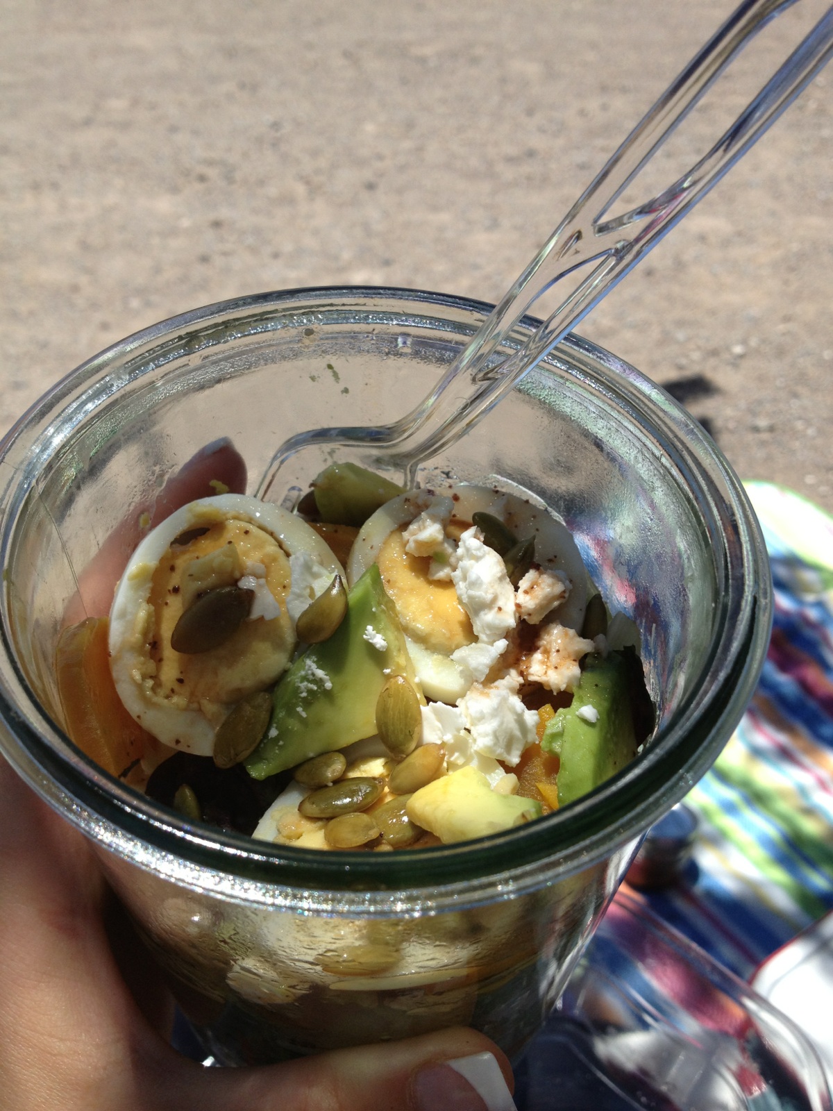 6. In the bottom of the Weck jars, add a little salad, then begin layering with beets, egg, and avocado, repeat until almost at top and finish with feta cheese and pepitas.