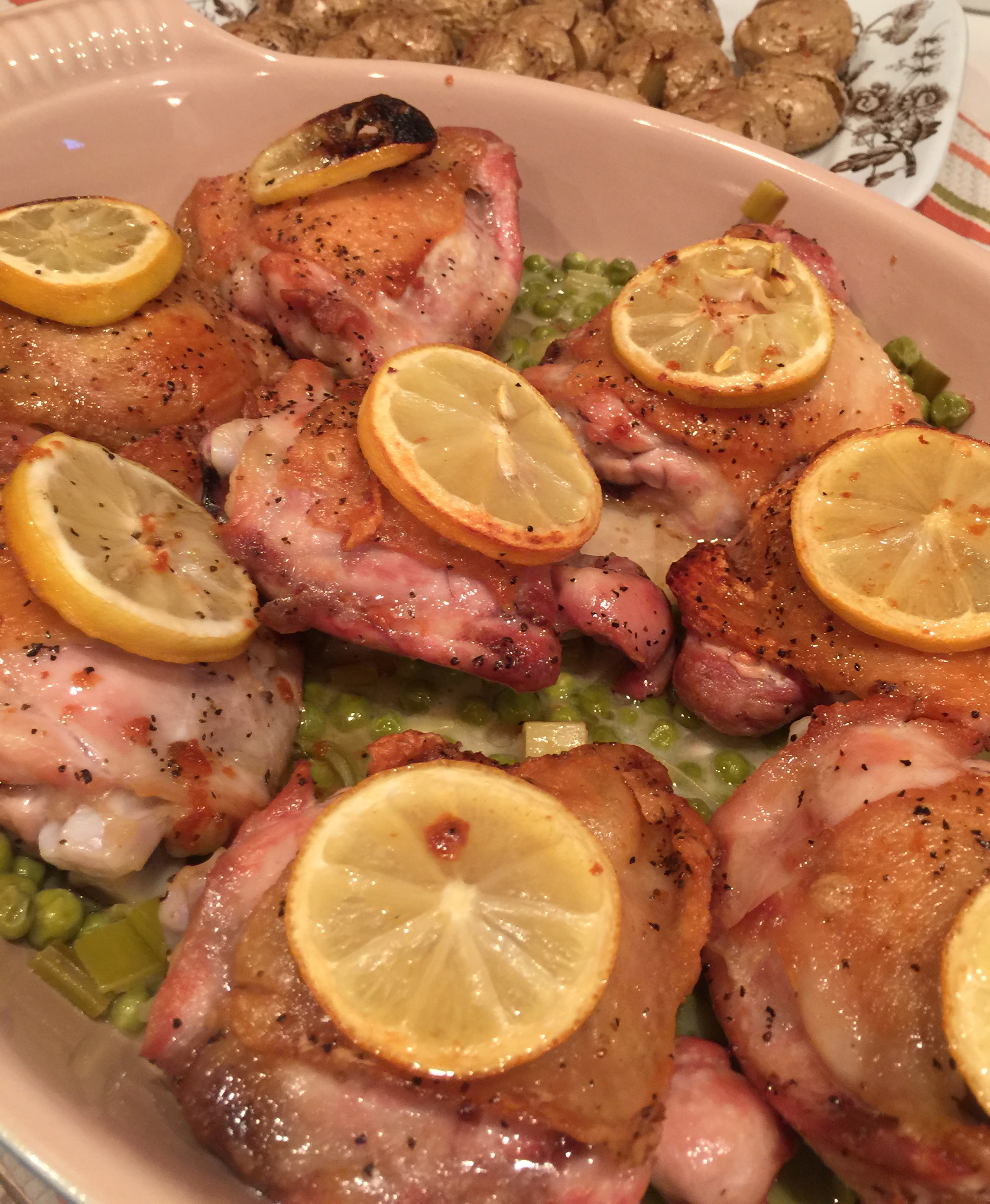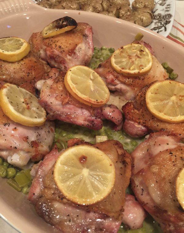 So my solution on those late weeknights and cravings….lemon chicken with leek-pea sauce. Chicken thighs are my favorite part of the chicken because of the flavor and ANY time of year they sound delicious. They cook relatively quickly, stay moist, and if I just have time for a salad to accompany, that works out but if I can, I like to roast some baby potatoes along side……the cool thing about chicken is you can pair almost anything for a side that sounds yummy so get those creative juices flowing!