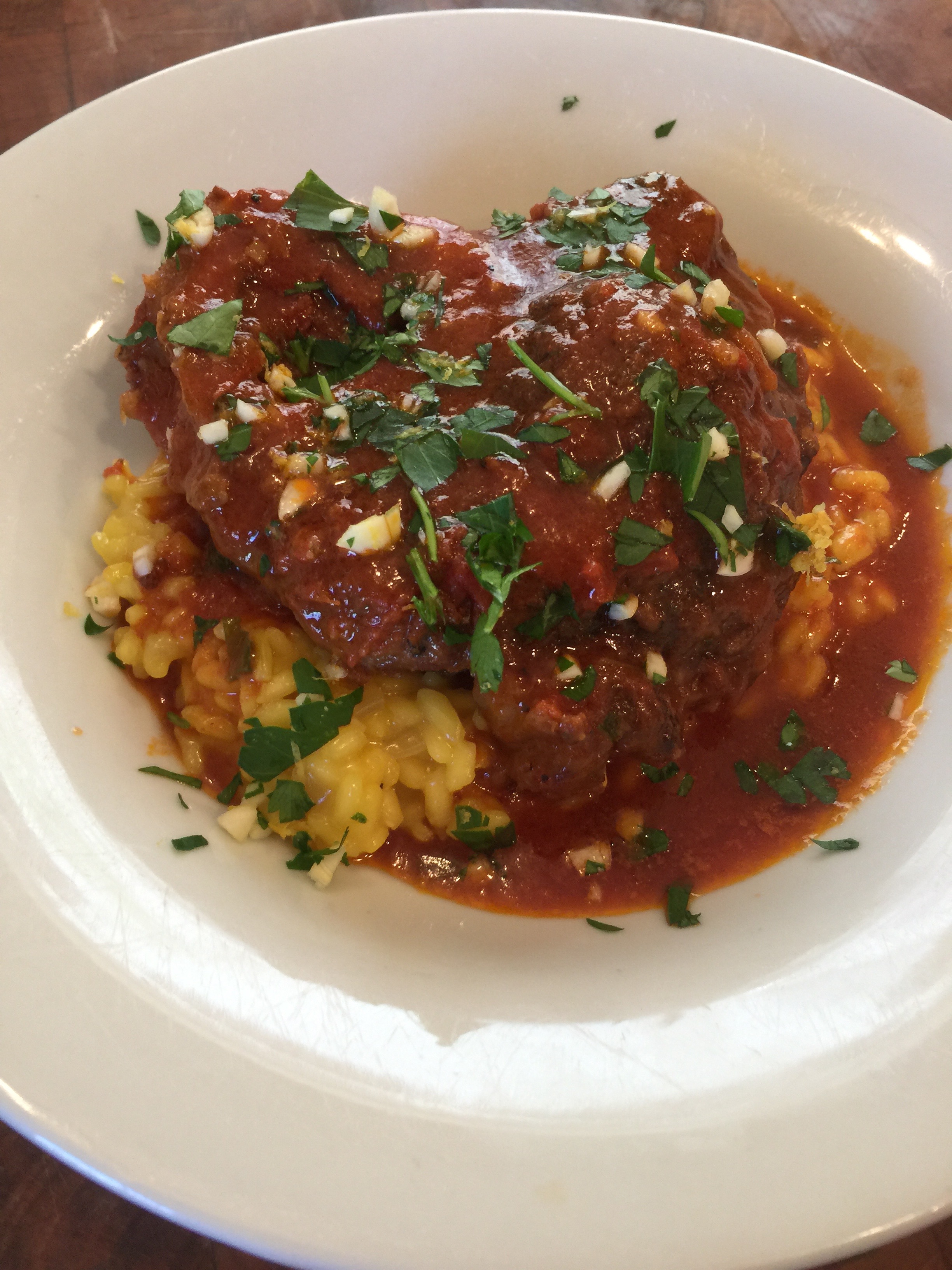 First she ladled a beautiful mound of risotto Milanese, so golden in color it almost didn’t look real, and resting beautifully on top was a thick, oval piece of deeply braised meat covered in a shimmering dark red sauce. My mouth was watering as I watched the final touch of fresh parsley, lemon zest, and garlic flutter over the top. I had just witnessed the ensemble of my first Osso Buco.