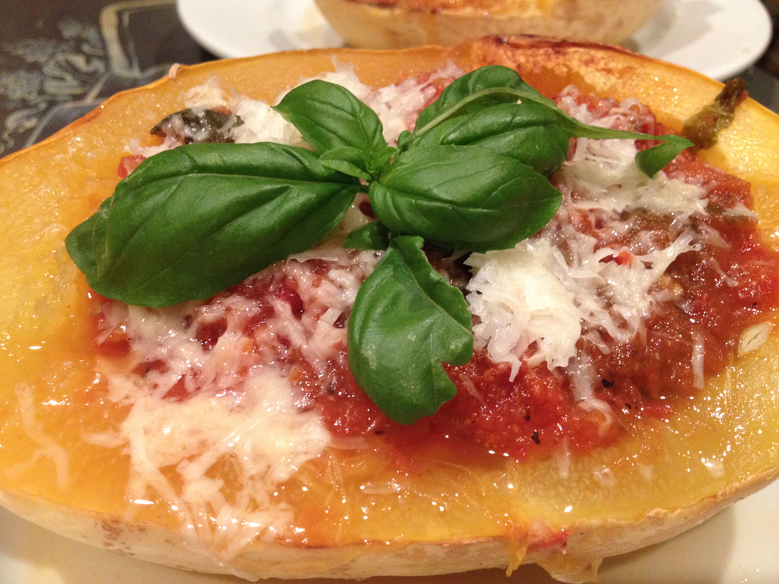 6. When squash is done, turn over and scoop out seeds. Add marinara sauce and top with pecorino.