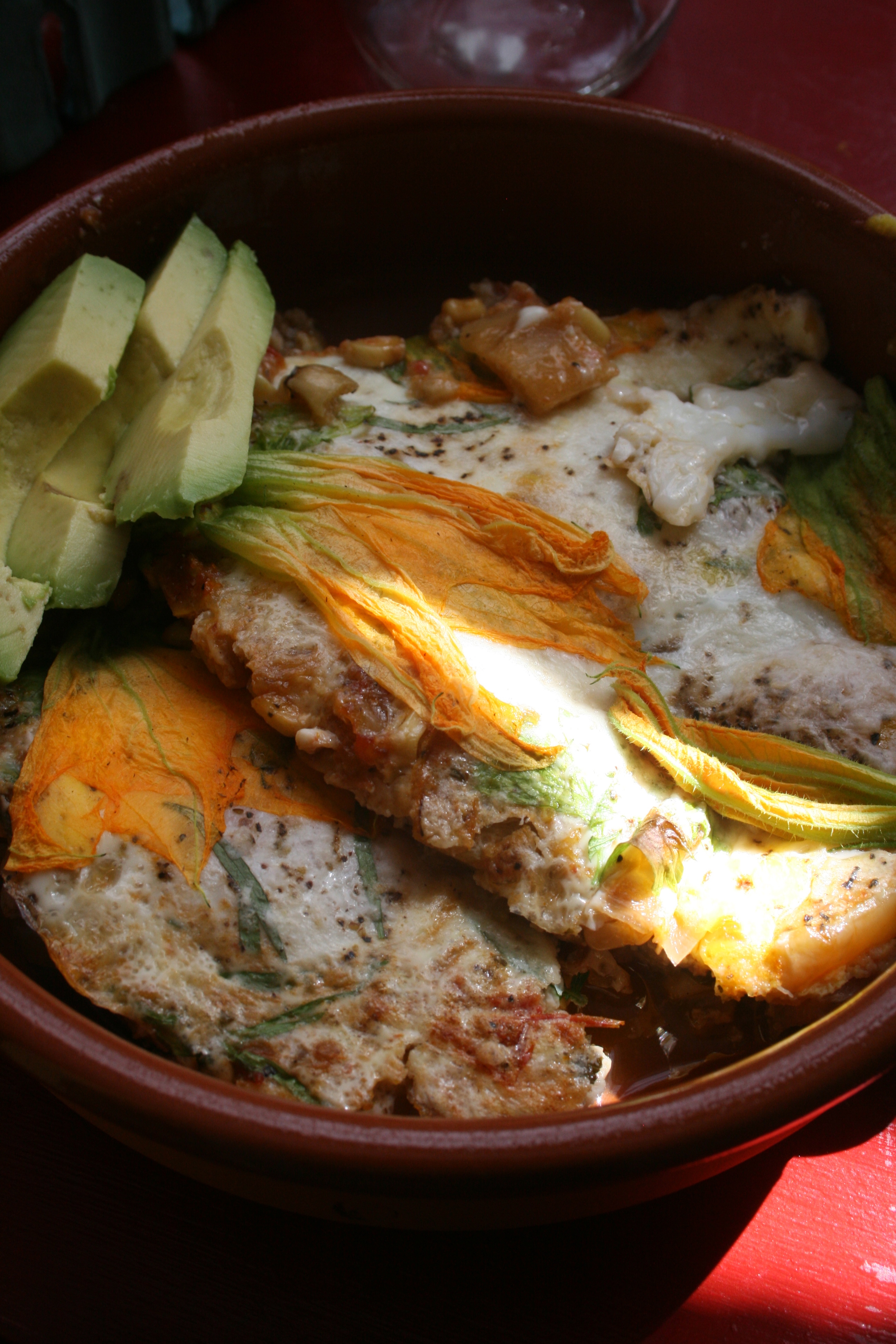 One of my favorite dishes is squash blossom over baked eggs. If I need a quick meal or a slow Sunday breakfast, this dish satisfies and never disappoints. Serve it up with warm toast or add roasted potatoes or both, your choice but make sure you have some homemade jam to accompany.